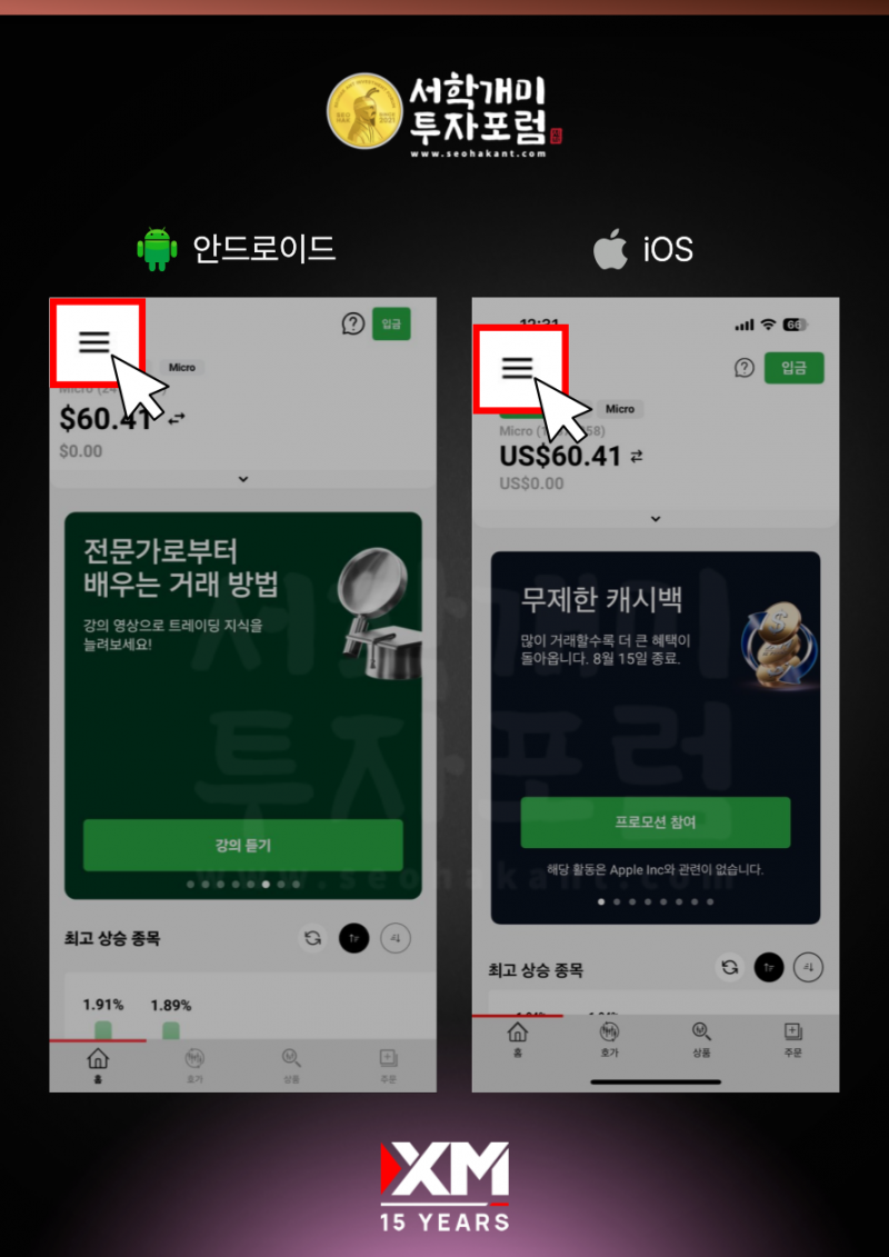 🔄 XM 거래소 앱에 접속한 뒤 왼쪽 상단 메뉴를 열어주세요. (☰ 클릭)