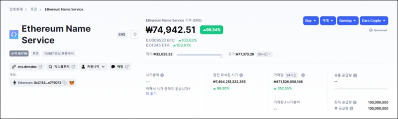 ▼ 이더리움 네임 서비스(Ethereum Name Service, ENS) 코인마켓캡 실시간 시세 확인하기