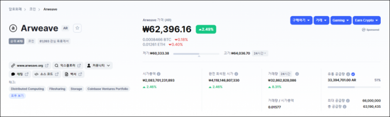 ▼ 알위브(Arweave, AR) 코인마켓캡 실시간 시세 확인하기