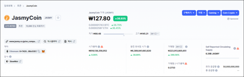 ▼ 재스미코인(JasmyCoin, JASMY) 코인마켓캡 실시간 시세 확인하기