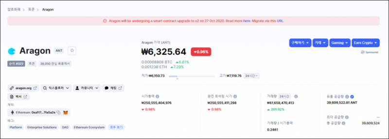 아라곤(Aragon, ANT) 코인이 한국 시간으로