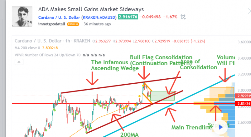 I have been in a bit of a time crunch lately and realized that I made some mistakes that might not have mattered to someone that understands technical analysis , however it would completely confuse a beginner. Since, I assume I have some beginners here, I decided to take some extra time out of my day, slow down, and explain what I see properly. This way, it will avoid any undue confusion, because that is the last thing I want to do. If you want to understand why the gains are so small, and we are seeing bullish and bearish patterns, you have to take a look at BTC . BTC has been trading sideways for about 2 weeks now. When an asset is trading sideways it becomes vulnerable to price movements by either bears or bulls, and really, there is no way to tell which way it is going to go. Traders hate sideways markets the most due to their unpredictability. So, that being said, it is taking the steam out of a lot of assets. Now lets look at ADA, you can see the slope of ADA is beginning to flatten, this means it is losing steam and its bull run is coming to and end. This can always change depending on the direction of the market, but right now, people are reluctant to trade when the market is sideways. Not to mention the ascending wedge that is forming, which is letting you know a pullback is on its way. However, like I said in my last chart, this happens very slowly, and usually takes more than 2 major higher highs and 2 higher lows to occur. The important thing to know is that a pullback is likely on its way. That being said, there is a possibility that ADA can reach the target between 2.16 and 2.24. That is not very far from its last high. However, unless I see another sign like a change in the overall market direction, I will assume a pullback. So if you think about it, the risk reward isn't too good if you are entering ADA at this point. We are looking at smaller highs, a flattening slope, tiny highs, an ascending wedge , and overall market uncertainty. On Sep 15th El Salvador will make a decision whether or not BTC becomes legal tender. That is important to note. Another important thing to note is that there are likely people holding out on ADA until they see smart contracts released live on the 12th, I expect a small bump from that. The most important thing here is the overall market and the signs. I expect ADA to keep consolidating, however if there is a break below the 200MA, watch it carefully, and I mean that. I will continue to update you on this as much as I can. Again, I apologize for any confusion from my last post and I hope this helps clear things up.