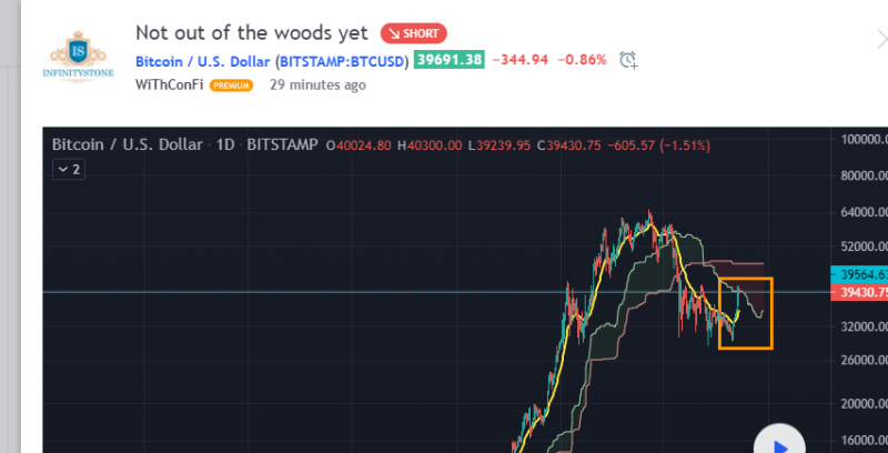 Looking at what Nov 2019 we can see everything looked great until there was one more drop. We are not out of the woods until we see a strong bounce from a support key level around $35.5k above the yellow line 21 EMA . Either that or price needs to continue to moon without a strong support bounce.