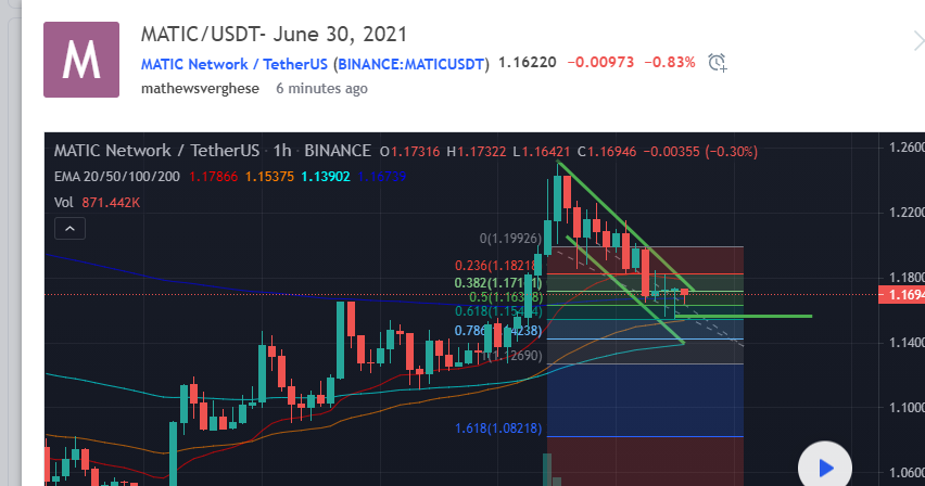 Quite undervalued and well below its highs of USD 2. MATIC continues to be an amazing project and at a steal at these prices. Yesterday, we saw MATIC go up to 1.20 and a little beyond that. However, the BTC pull back has affected it as well with prices coming down to 1.15. At this stage , it may be a good time to enter MATIC especially if BTC starts moving up. MATIC can easily climb with BTC back to 1.20 and well beyond that..It is currently in a narrow channel downwards. If BTC shows strength today, we will see MATIC rise beyond that channel and slwoly moving upwards. Patience will be required for MATIC as there is many a hurdle to cross before 1.60 or 1.80.
