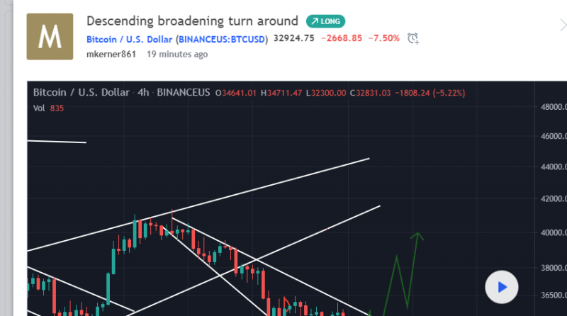 Won’t spend much time explaining this one. Broadening wedge , selling spreading out, bullish . Looks like a short term bottom atleast. In a long at 32300 , will see how it plays out . See if we can break out of the wedge . Low leverage for me here and a stop loss just below break even . More downside always possible . Stay safe out there