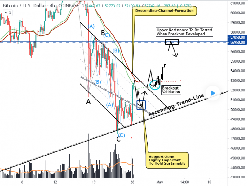Welcome to this analysis about Bitcoin , we are looking at the 4-hour timeframe perspectives. In recent times Bitcoin has shown up with an interesting upside bounce firstly initially on the local timeframe perspective moving above the previous resistance now as I discovered Bitcoin has established this main descending-channel-formation. When Bitcoin manages to stabilize within the range in the channel as shown in my chart to form a breakout above the upper boundary this will lead to a continuation to the upside and testing of the remaining upside-targets marked in my chart around the 56950 levels, therefore it is highly necessary that Bitcoin holds the supports and do not fall below them because this can possibly invalidate bullishness.