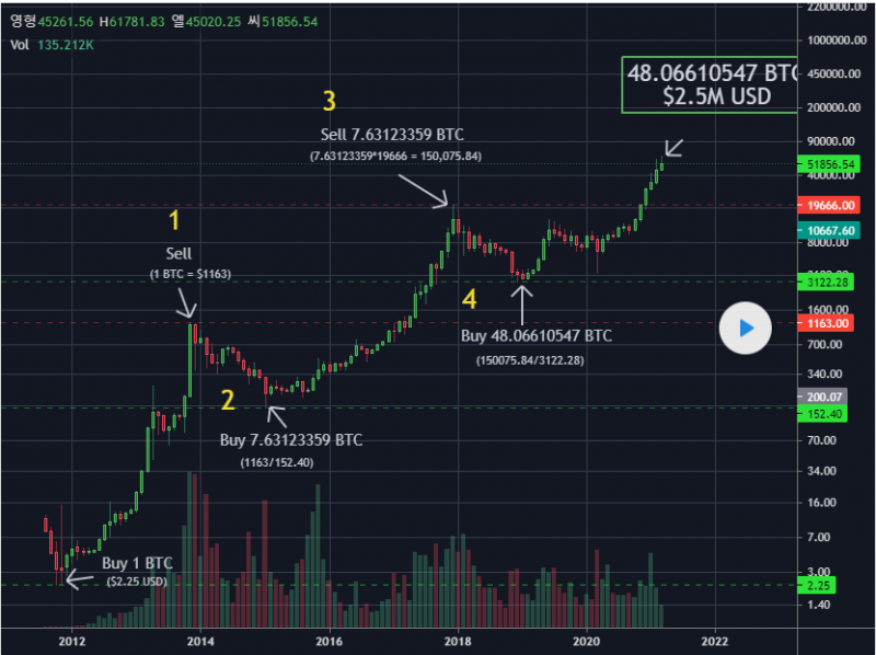 2011 년 11 월에 $ 2.25에 BTC 1 개를 매수 하고 그 이후 9 년 이상 동안 4 개 (그리고 단 4 개)의 완벽한 BTC / USD 거래를했다면 지금 귀하의 포트폴리오가 얼마나 가치가 있을까요?