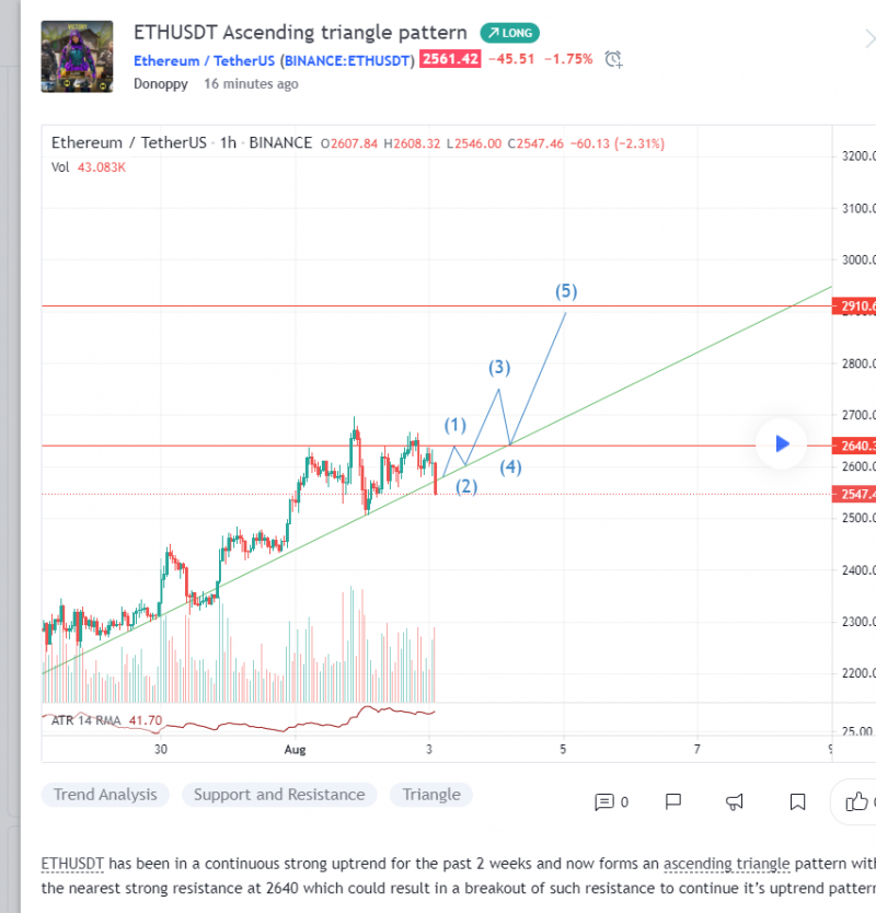 ETHUSDT has been in a continuous strong uptrend for the past 2 weeks and now forms an ascending triangle pattern with the nearest strong resistance at 2640 which could result in a breakout of such resistance to continue it’s uptrend pattern.