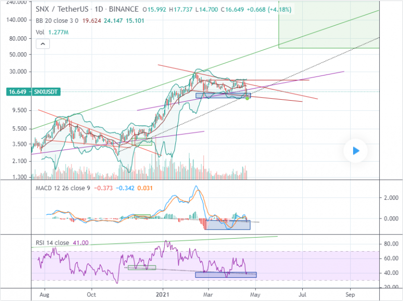 RSI와 MacD는 잘 리셋되었고 우리는 녹색 상자의 낮은 부분과 파란색 상자의 낮은 부분에 강한 차이가 있습니다. 파란색 상자에는 RSI의 머리와 어깨도 표시됩니다. SNX는 다른 다리를 올릴 준비가 될 수 있습니다.