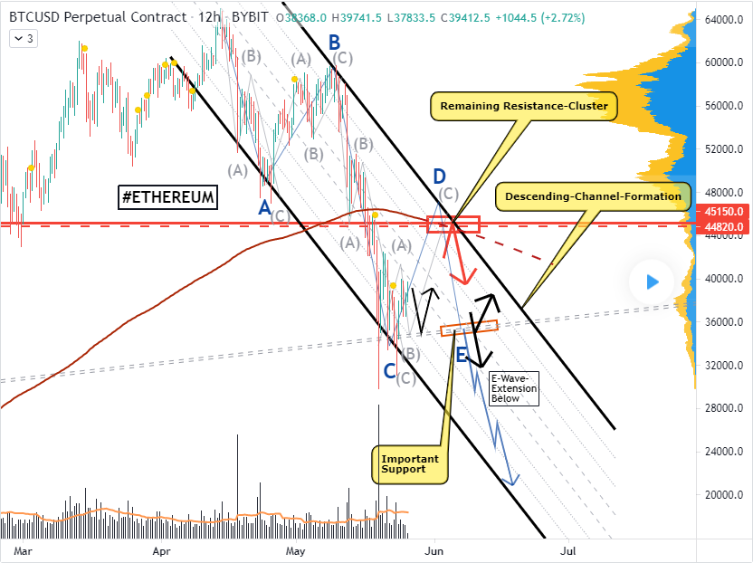Welcome to this analysis about Bitcoin , we are looking at the 12-hours timeframe perspectives. Since Bitcoin moved on with the bearish exaggeration it reached serious remaining support-zones in the structure especially determined by the ascending-trend-line marked in dashed grey where Bitcoin initially bounced. Besides that Bitcoin has established this main wave-count with the waves A to C almost already finished and now with the wave D to likely have its origins within the ascending-support-level as marked in my chart however this wave D will run directly into the upper resistance-cluster from where a pullback is very likely and therefore will be the origin of wave E which, this wave E has the ability to finish within the ascending-support and show up with a bounce from there otherwise when this does not happen Bitcoin will move on further with a wave-E-extension when it closes below the support as shown in my chart, it will be an important development ahead.