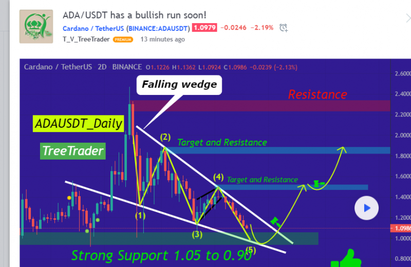 So ADA/USDT Is now In a Falling wedge pattern. this is of course a Bullish pattern that tells us that there is a Incoming Bullish movement! if we take a closer look we can see the Elliot waves principle! but It's a bearish one and now the price is on the 5th wave! after the completion of the 5th wave we can expect the starting of the ABC waves to be formed which is the beginning of a bullish movement! there is another reason that we think the price can't fall below 0.9 because It's a strong support which has worked for quite some time! so when the 5th wave is completed the price can reach 1.50 first and than after a correction it should go for 1.90! strongest resistance for ADA is 2.30!