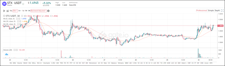 스택스(STX)는 2021년 8월 30일 기준 전일 대비 +5.32% 상승한 $1.4945에 거래되고 있으며, 게이트아이오(gate.io)와 업비트에서 거래되고 있습니다.