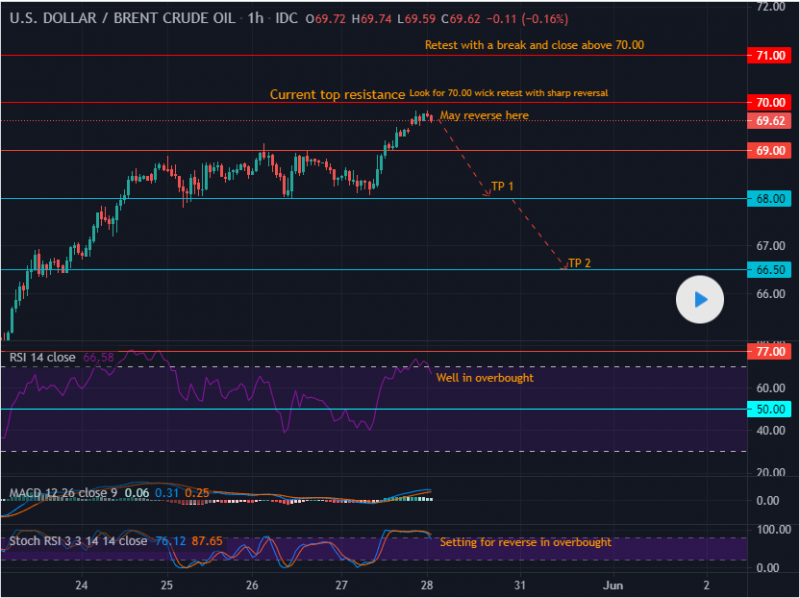 Presented is a 1 hr chart analysis leaning towards a sell off. We are retesting our top resistance area of 70.00. With immediate volatile action in this zone sentiments a sell off.