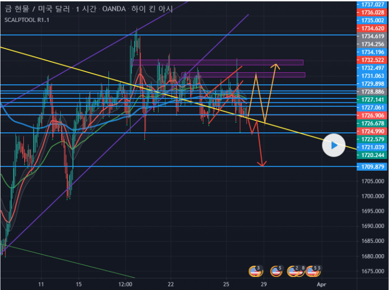 시나리오 2-노란색 선을 깨지 않으면 바로 1745까지 올라 갔다가 다시 내려와 노란색 추세선을 다시 테스트하고 깨지지 않으면 여기 (1727-1745)에 다시 며칠 동안 범위를 지정합니다. 결국 1750+ 지역까지 올라갑니다.