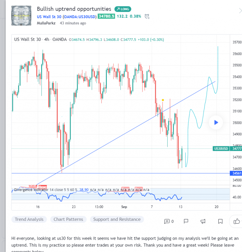 Hi everyone, looking at us30 for this week it seems we have hit the support judging on my analysis we'll be going at an uptrend. This is my practice so please enter trades at your own risk. Thank you and have a great week! Please leave comments below