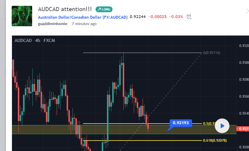 AUDCAD   right at 0.921 is the confluence of fib 0.5 and previously broken resistance, this could be a very good long order, if you are more careful you can wait for the price to bounce