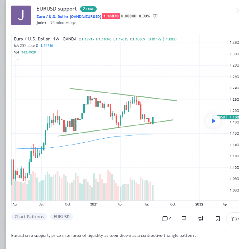 Eurusd on a support, price in an area of liquidity as seen shown as a contractive triangle pattern .