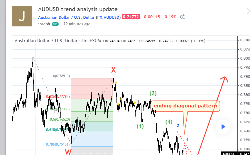 Technical analysis of the Australian dollar. Expect 5 waves of the last ending diagonal pattern. The end of this correction could be the beginning of a new monthly support key level.