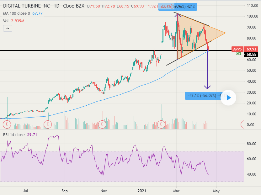Following a year of unbelievable returns, perhaps we're now seeing the anticipated correction. Yesterdays market-wide selloff expressed as a symmetric triangle breakdown in the APPS daily chart . More losses followed today. Two-fold support from the MA100 and at 68.70 currently. Freshman price target from the triangle is near 33.20, which could sting. Or maybe it will bounce and give us another 1400%.