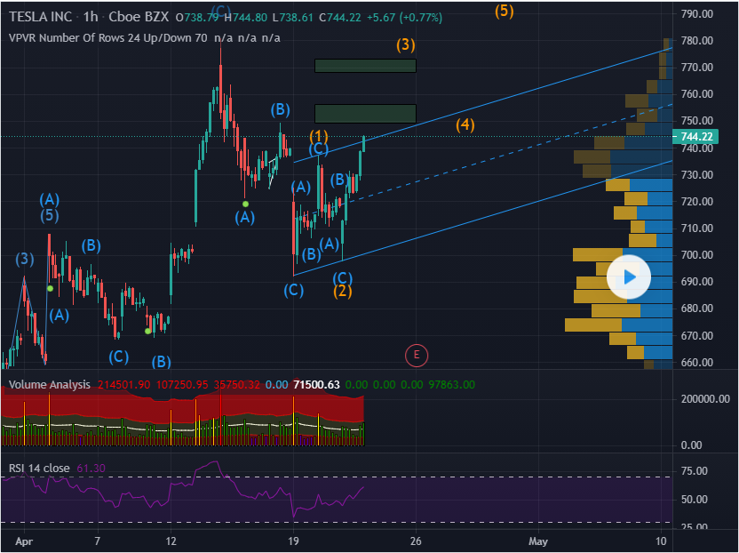 I believe we are in a wave 3 in TSLA headed towards the 770 price point. There might be a short-term rejection in the 749-754 area which will provide a dip-buying situation but if there is enough momentum we could see a very brief rejection as we saw today.