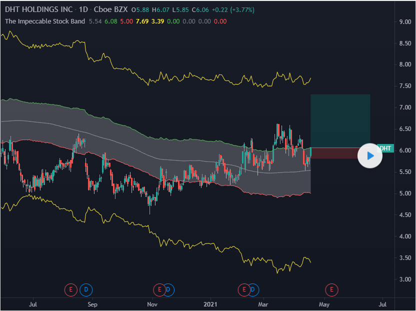 Description: DHT is trending higher and in an uptrend meaning that highs are getting higher and lows are getting higher. The uptrend line on the chart and the Trending Band Indicator (which measures trend) supports the Long Position.
