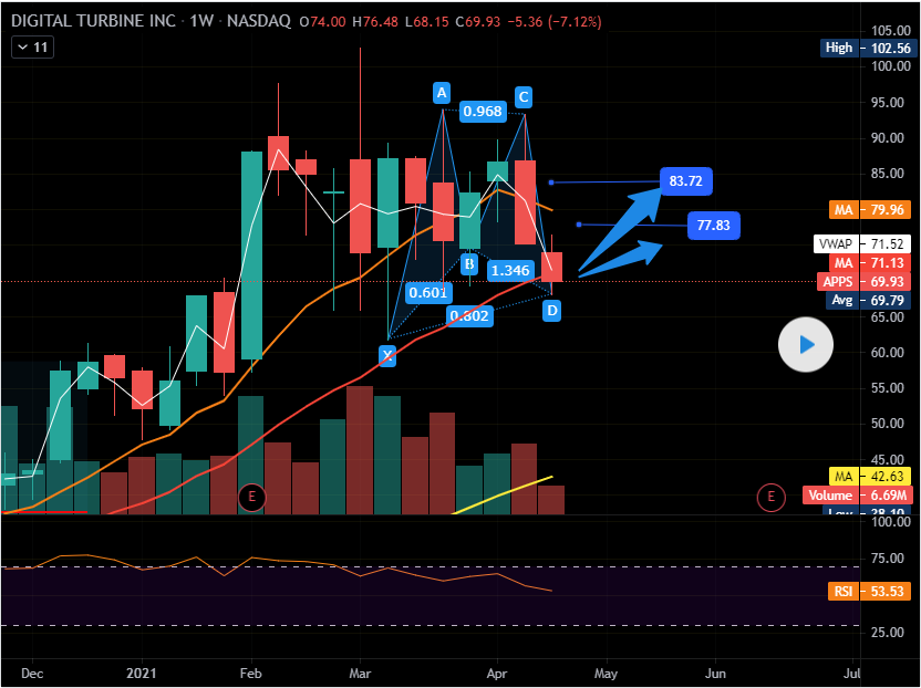 APPS ( Digital Turbine ) Bullish Cypher Weekly Chart TP 1 - $77, TP 2, $83.50 SL 61.5 around 1-2 risk to reward. THis is for educational purposes and not for trading. Thoughts?