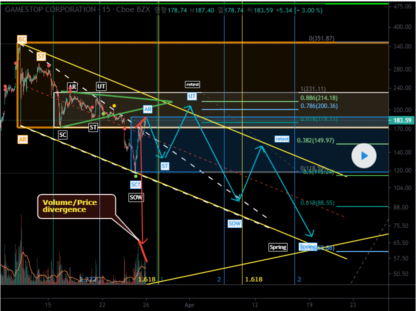 그래서 지금 제가 보는 방식은 우리가 형성하고있는 또 다른 축적 거래 범위의 자동 반응 단계에서 정상을 차지할 가능성이 높다는 것입니다. 이것이 AR (또는이 가격에 가까움)이라는 몇 가지 적절한 지표가 있습니다. 우리는 볼륨 발산이 있고 낮은 볼륨 에서 더 높은 최고치를 만들고 있습니다 이것은 임박한 반전의 전형적인 지표입니다. 그래서 저는 AR이 있었다는 생각을 좋아합니다. Wyckoff 모델의 세 번째 단계는 범위 재 테스트 (ST-2 차 테스트)입니다. 이것은 업 스러스트로 강하게 이동하기 전에 판매자의 범위를 테스트합니다. 업 스러스트는 아마도 너무 강하지 않을 것입니다. 이것은 제가 당신이 부족해야하는 것에 대해 내가 말하고있는 200 달러를 치는 것을 볼 때입니다.