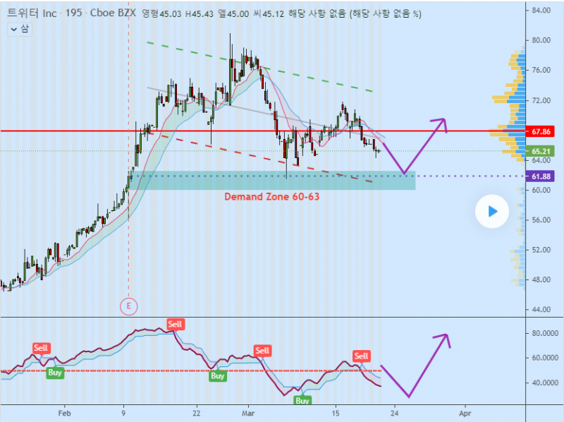 TWTR 은 수입 후 이익의 상당 부분을 제공했지만 수요 영역 인 60 ~ 63에도달했습니다 . 추가 하락을 기다리는 동안 ATM PCS 는 천천히 매수 포지션에 진입하는 것이 좋습니다.
