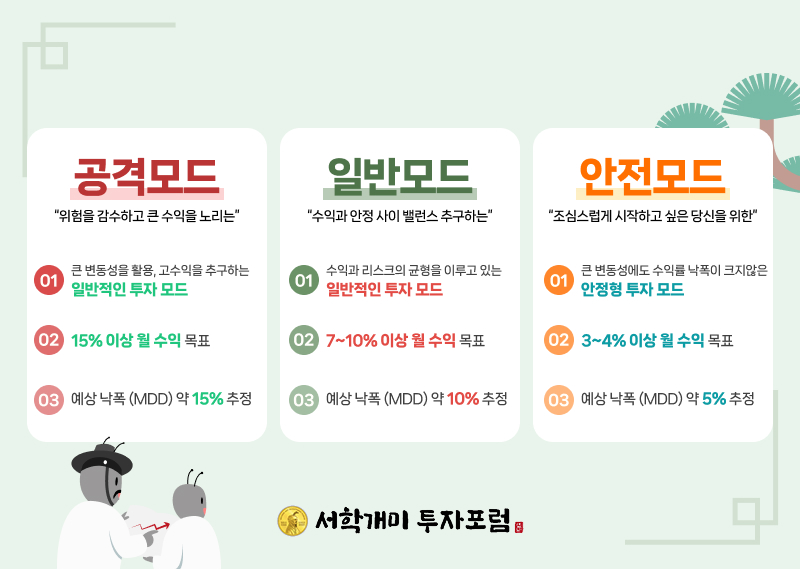 😄 안전모드 | 큰 변동성에도 수익률 낙폭이 크지 않은 안정형 투자 모드 | 약 5% | 3~4% |