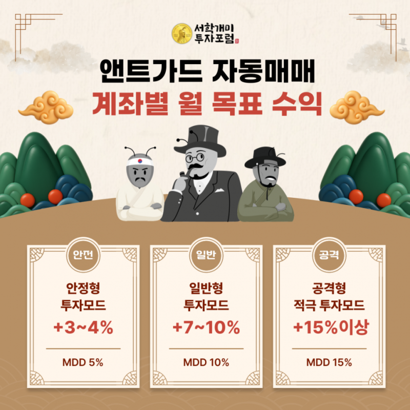 안전 모드 | 큰 변동성에도 수익률 낙폭이 크지 않은 안정형 투자 모드 | 약 5% | 3~4% |