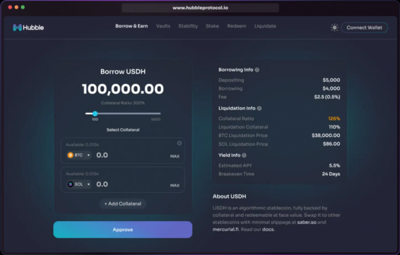 허블 프로토콜(Hubble Protocol, HBB)은 솔라나 기반 분산형 DeFi 프로토콜이며,