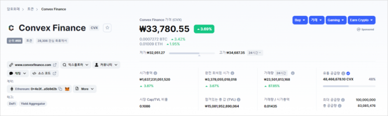 ▶ 컨벡스 파이낸스(Convex Finance, CVX) 코인마켓캡 실시간 시세 확인하기