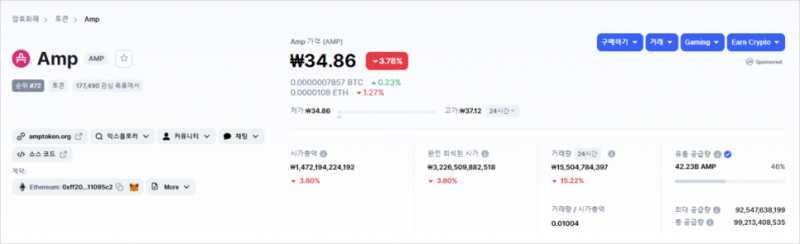 ▶ Amp(AMP) 코인마켓캡 실시간 시세 확인하기