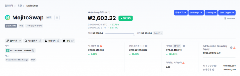 ▶ MojitoSwap(MJT) 코인마켓캡 실시간 시세 확인하기