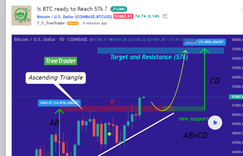 BTC has formed an Ascending Triangle! The price can Increase as much as the Measured Price Movement ( AB=CD ) . the Price is now above 51k which is pretty awesome for Bulls. Yesterday's Candle has done The Break out needed to reach 57k, and This candle closed above 50k,so the way to 57K is pretty easy to reach!