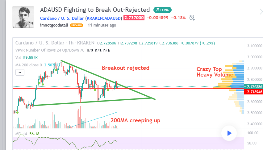 So what's the point? The bad news is ADA will likely retest the bottom of the descending triangle and the price will likely fall to find support. The good news is, it really cant fall too far. The market cap is increasing, the support volume is large, the 200MA is right below, and people are buying. Interestingly, it looks like they are holding on to it as a future investment. That is great news for ADA.