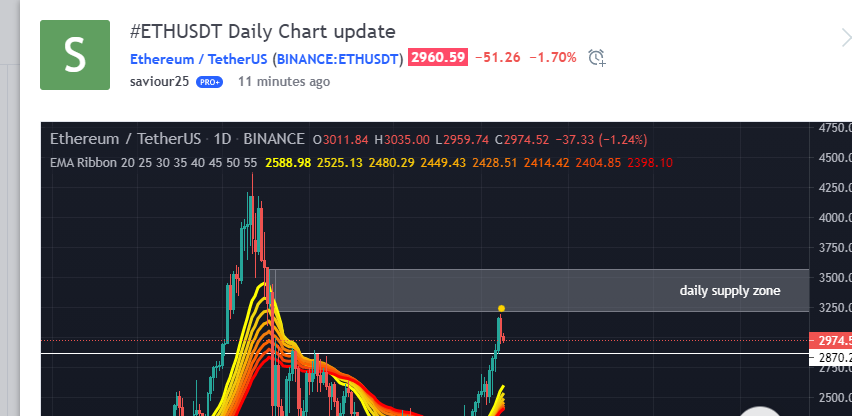 Like i said before, price touched the daily supply zone and backed down like expected. However, RSI is still overbought and MACD is showing weakness, but price is still trading far above the EMA ribbon. This could mean that price will most likely retest the $2,870 level or if price holds above $3,000 we would see good moves to the upside.