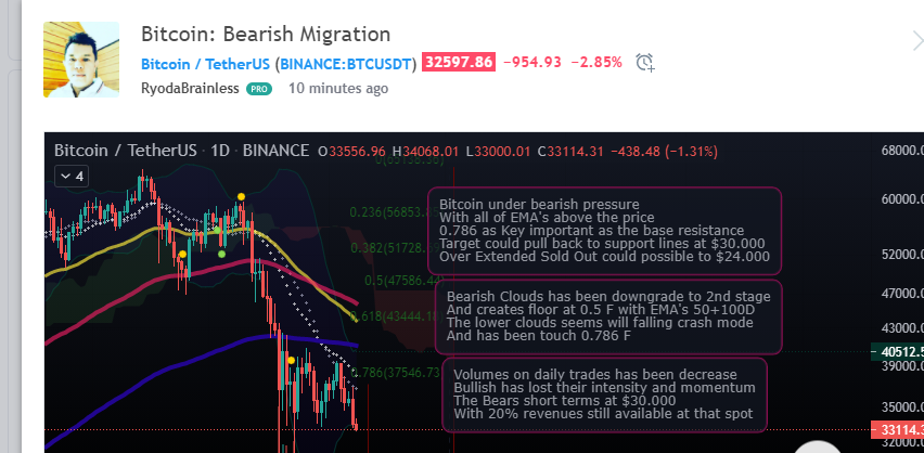 Bitcoin seems under pressure by Bearish Short Terms movement, the market suddenly aware about the bears strategy to pull back the price near the market closed time. The pressure has won the important key at 0.786 F. And the result now on below $30.000 on the spot red light. With possible over extended sold out to $24.000 spot.