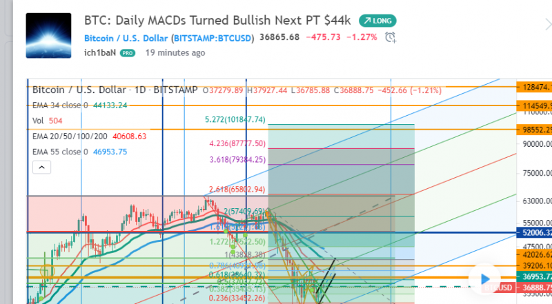 MACDs have just turned bullish on BTC and will give momentum to BTC over coming days as the next Fib Extension target is $44k then $52k on the 1.618.