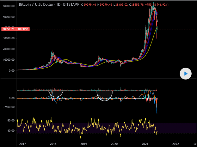 If you look over 2017 and 2019 positive price action moves you'll notice something very similar to 2021's move in the way that we stayed above all moving averages. This is probably the most basic and trust worthy indicator to use when trading on all time frames. But being that we are looking at a Daily time frame getting under the averages usually means its going to take quite awhile before we get back on top. And even if we do I full heartly believe we are going to chop, chop, chop all around them all the way to the point big money says the hell with it. Big money is what was needed to get Bitoin where it is but I dont for one second believe they are gonna come plowing through the Bitcoin market with gobs of cash loading up. Any sane inverstor knows what they are looking at. Bitcoin broke the trend and topped out. Plain and simple ran out of steam. If institutions really want in the game, I assure you they are not buying the Fucking Dip. Maybe after youtube and twitter dies down, they will be positioning themselves but not now. If anything, the few institutions that are in would be currently unloading on the market since its to their advantage being every crypto youtube channel out there is telling them to buy now becasue its on sale. Don't get me wrong, I love trading the crypto market. I do think crypto has potential for a place in the world. But from a fundamental stand point, this isn't where we HODL. That was far more beneficial, say when we retested 20k and took off in the upward direction.