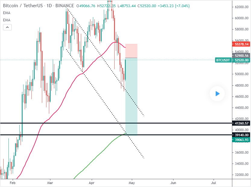 Bitcoin managed to bounce from the weekend lows, but this pullback is not the one that I expected. As I mentioned before I am not planning to go long until we go back to the 40k or even 33k level. Right now I am planning to short it since this is the only option to trade with low risk reward.
