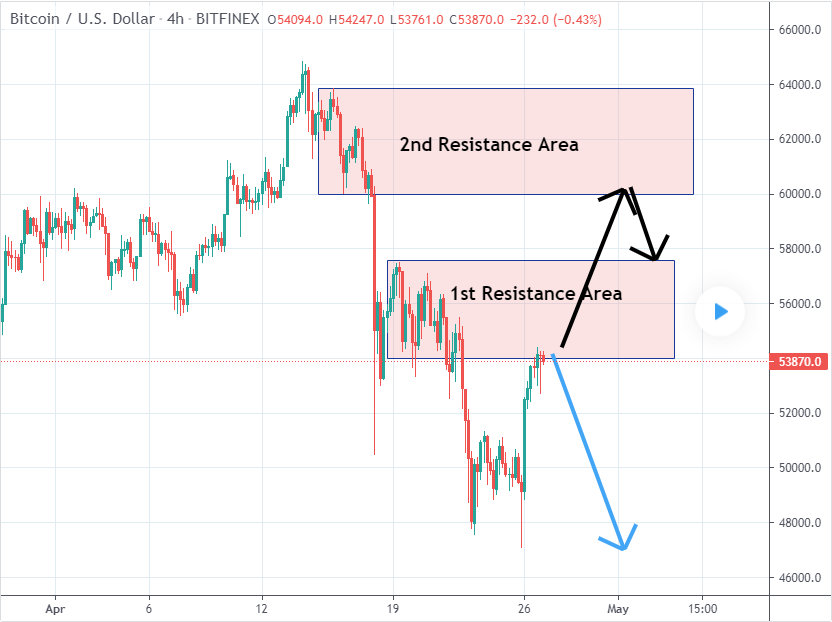 Bitcoin formed 2 resistance area first one at 54000 and the 2nd at 60000. If first resistance area holds, then watch the blue arrow scenario. But if it didn't hold, then the 2nd resistance area will highly show another drop (black arrow scenario).