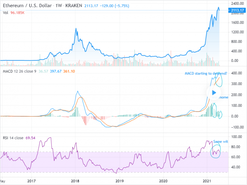 Here is the 5Y chart for ETH. As we can see, the MACD lies at a modest 398 and we can see the RSI start to descend. These indicators do not signal the bearishness of the BTC chart however.