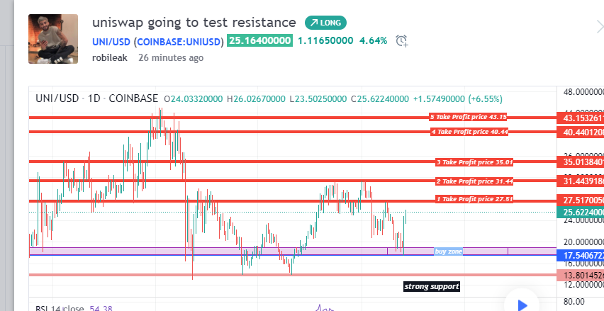 uni 스왑 첫 번째 저항 27.51 첫 번째 TP를 테스트합니다.
