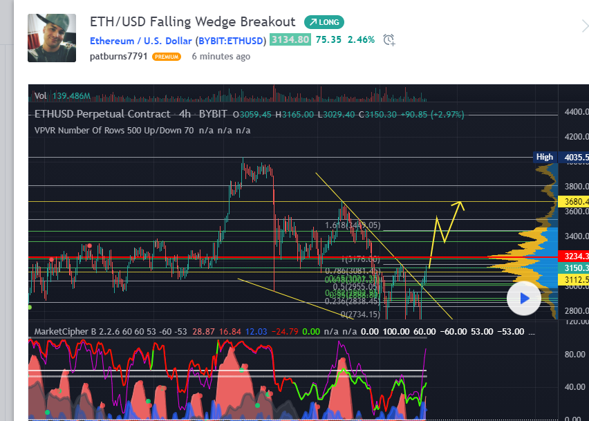 We had a nice break from this falling wedge and we are forming a pretty large W / potential inverse head and shoulders . Indicators are looking pumpy and we already got a pump from the macro golden pocket down around $2750 (exactly as I had predicted, by the way). Short term target is $3,680ish