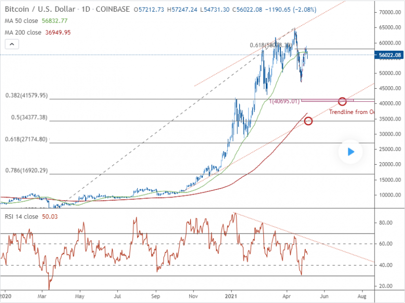 A pullback to 40k level and a hold above the trendline since October last year would be ideal for new long entries.