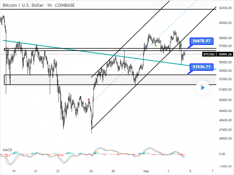 비트코인은 상승 추세 채널을 깼지만 54,700달러의 지지를 받았다. 56,600달러를 버틸 수 있다면 6만2,000달러로 다시 성장할 수 있을 것이다.