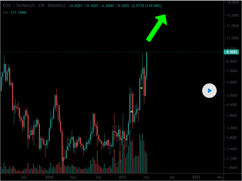 EOS에 대해 자세히 알아보겠습니다. 가격이 주요 저항을 시험하고 있기 때문에 이제 5배는 더 가면 강세장이 시작될 것이다. 그리고 EOS 로켓이 발사될 것이다. 위에서 보자.