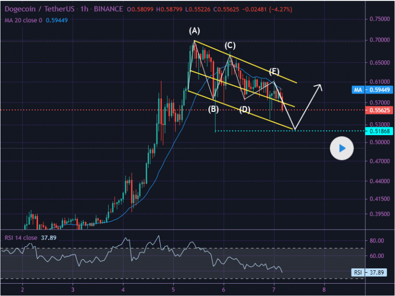 안녕하십니까, 이전 분석에 따르면 원하는 목표에 도달했습니다. DOGE는 지금 상부 채널에서 움직이고 있다. RSI는 약세를 보이고 있고 가격은 MA20 이하로 움직이고 있습니다. 나는 도표에 나타난 상황을 예측하고 있다.