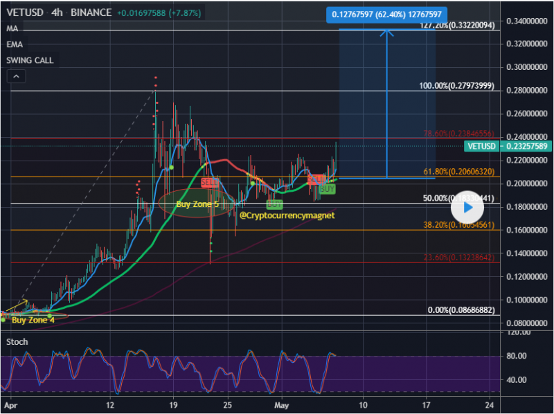 Vechain(VET) Explosive Move New ATH Target, 62% Gain to $0.14, we are very confident this new price target will be reached over the next coming days/week(s). Stochastics showing an oversold market on the 4h
